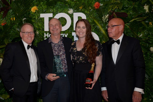 Hot Water Beach TOP 10 Park Owners Grant (centre right) and Sheree Webster (centre left), accepting award from TOP 10 CEO David Ovendale (far left) and TOP 10 Board Member Sue Stile (far right).
