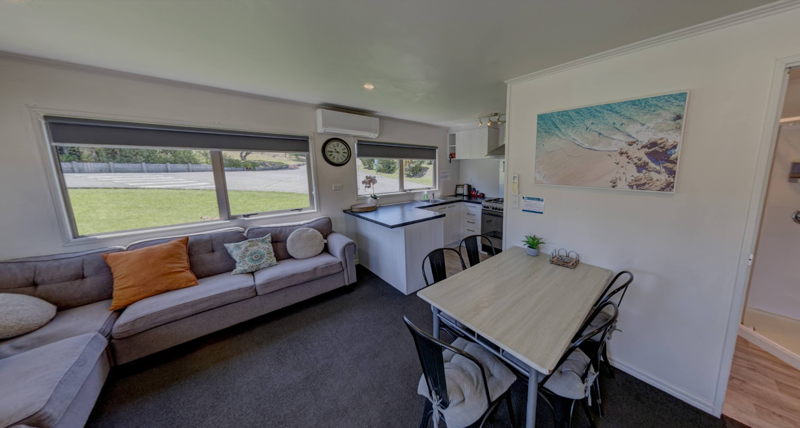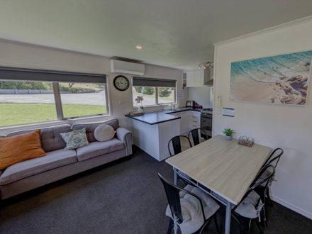 A flat screen television with Sky TV and an air conditioning unit are in the lounge area to make for a comfortable stay. The generous lounge area also doubles as a dining space.