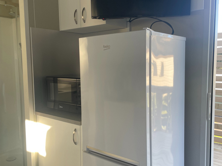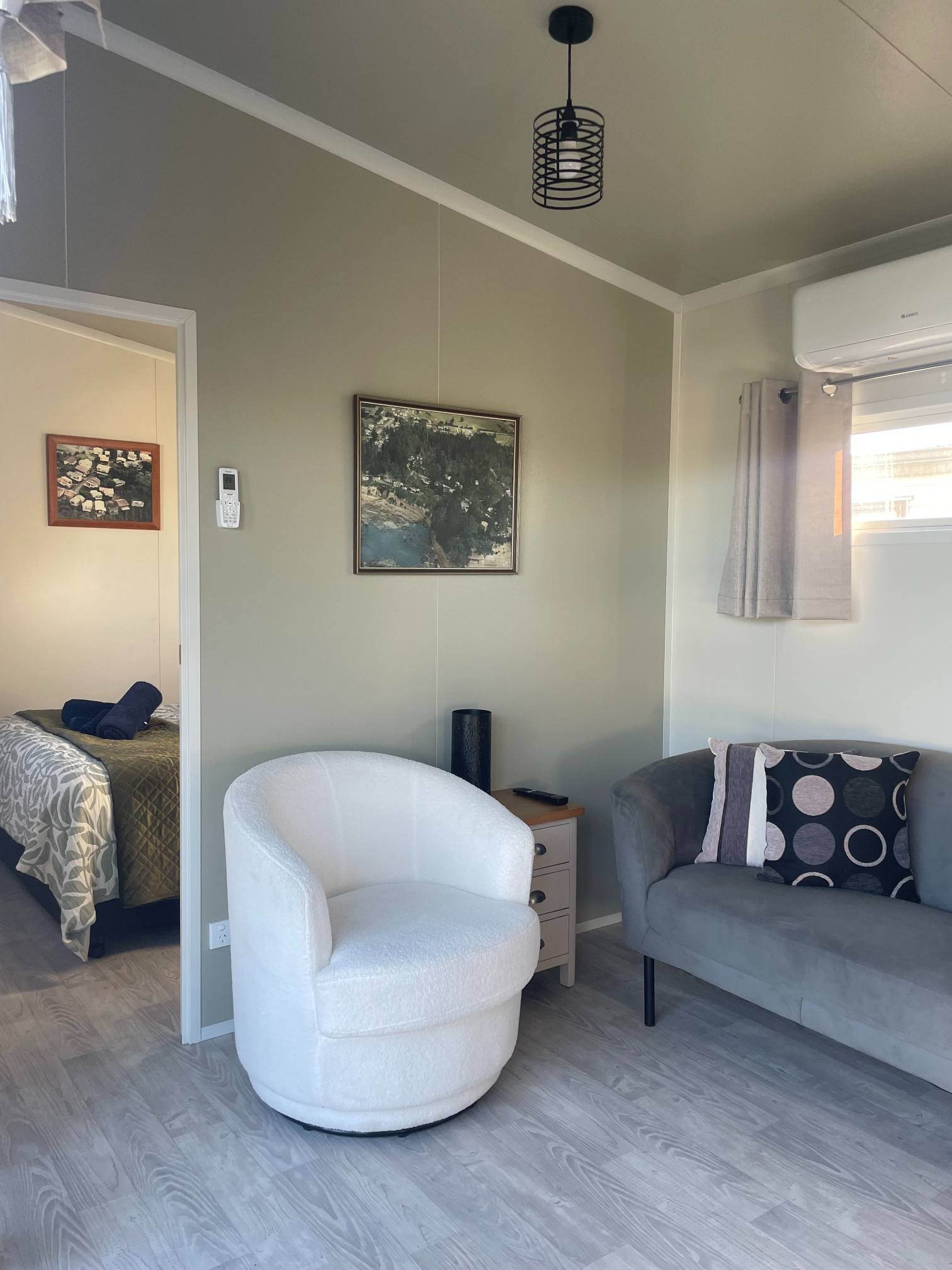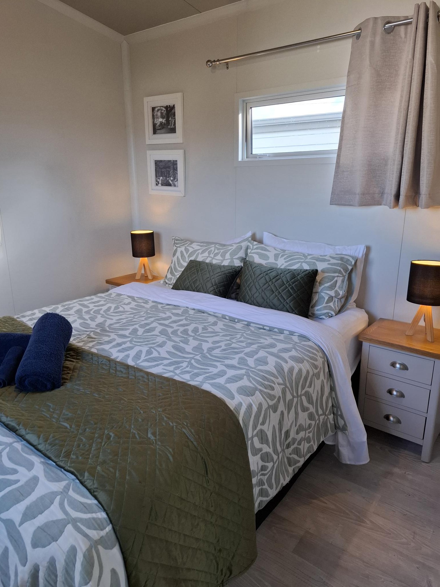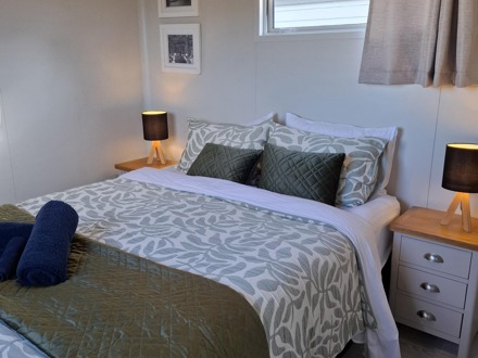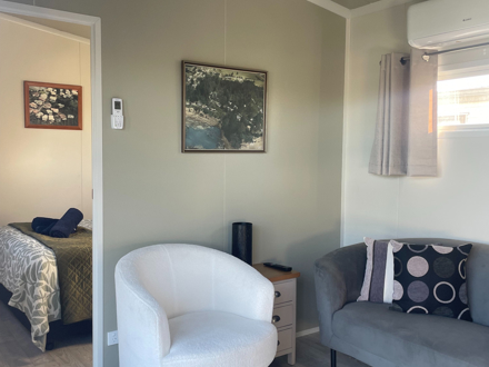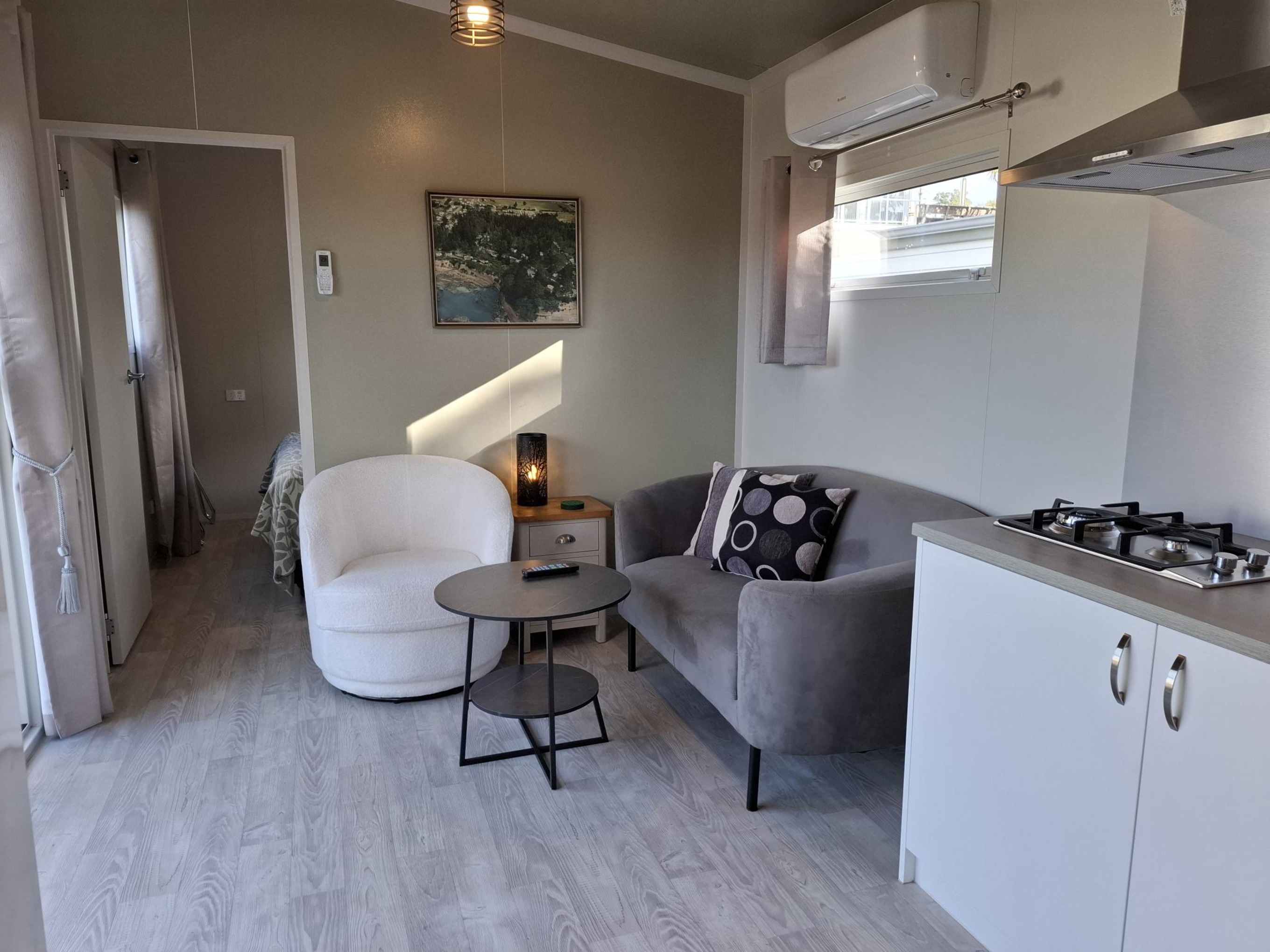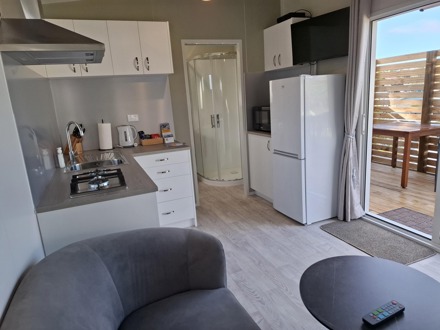 Our Tui Self-Contained Cabin has a small deck to enjoy the morning sun and has one bedroom, with a double bed. This includes a fully equipped kitchen with a washing machine, bathroom facilities & hairdryer. All bedding and towels are supplied. In the comfortable lounge area, there is a flat screen television with Sky TV and air conditioning for your comfort. The unit is serviced daily and has a non-smoking policy inside the unit. Smoking is only allowed in the dedicated smoking zones in the park.