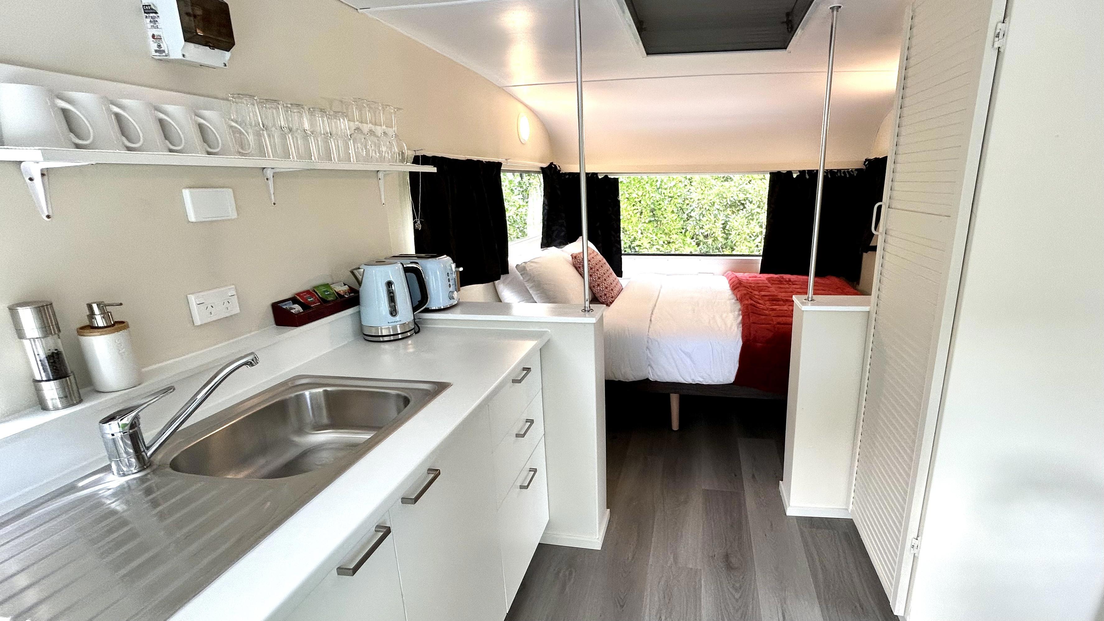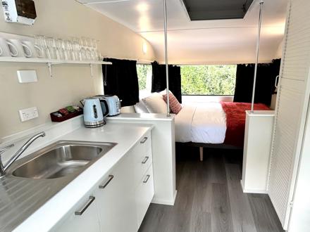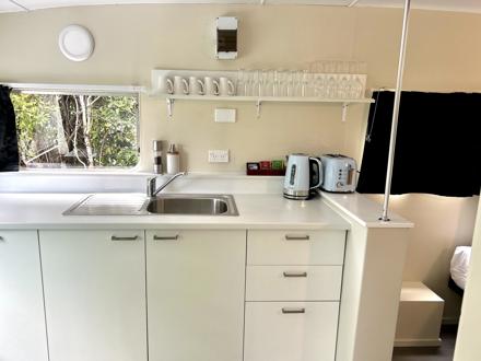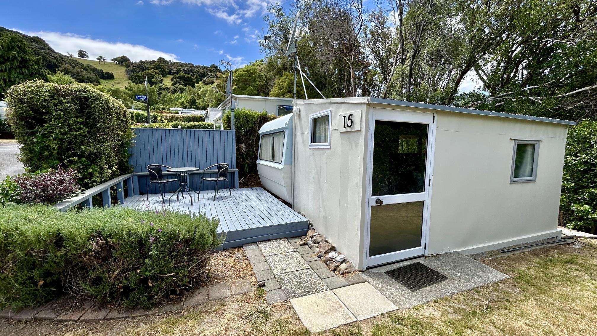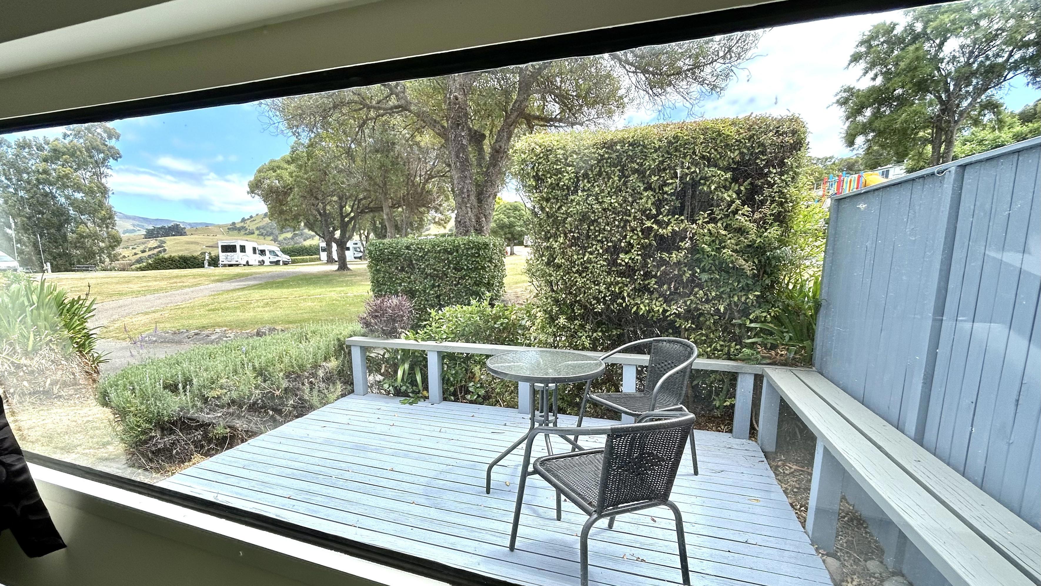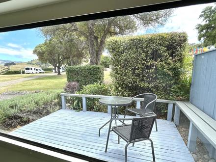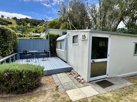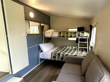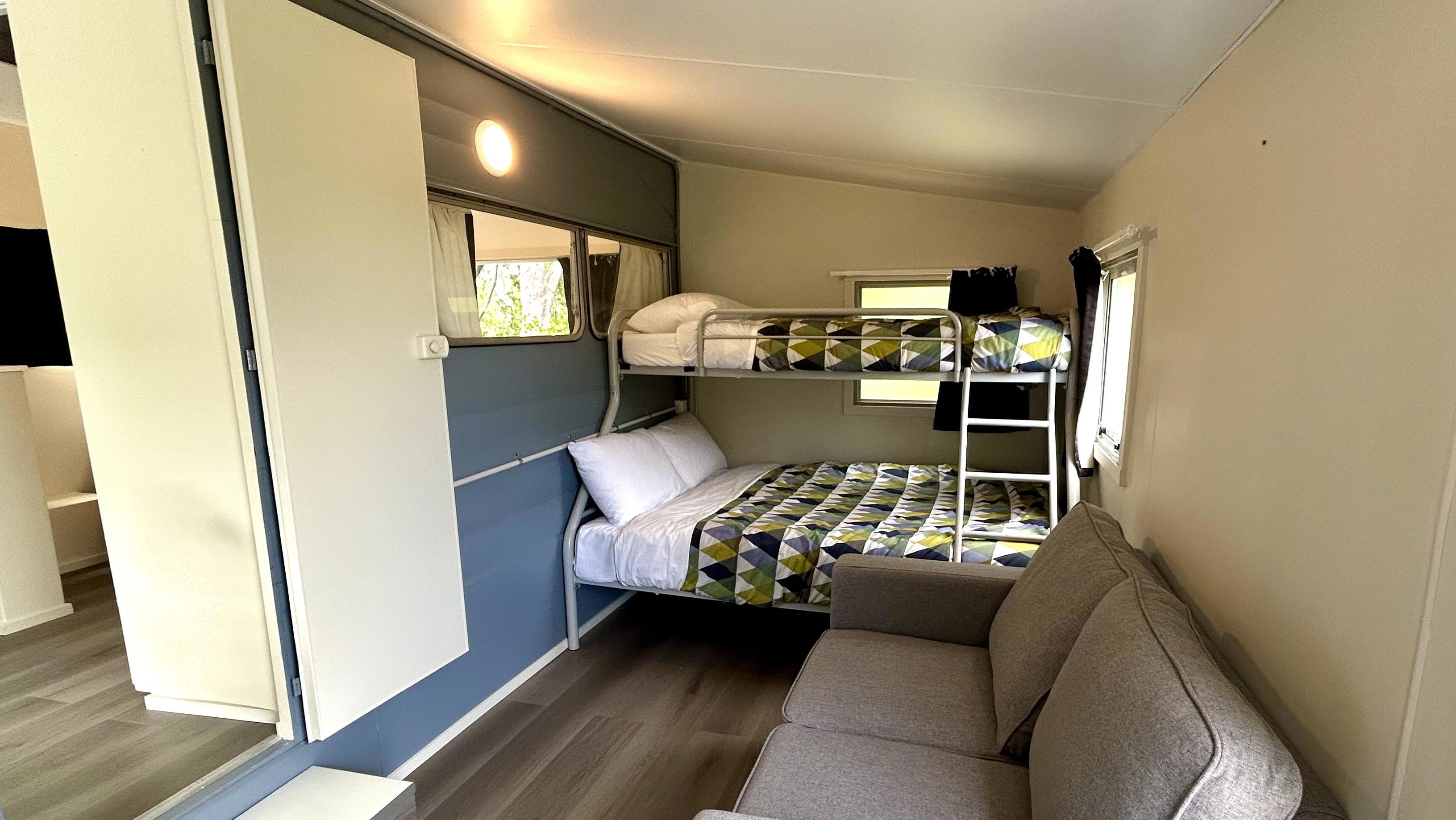 This caravan has a queen bed made up with linen and a separate living area with a set of tri-bunks. Kitchen with microwave, fridge and stovetop. Outside has a deck with coffee table and chairs to enjoy the view. The bunk room has a sofa, TV with Chromecast and a heater. There is no bathroom or toilet, but only a short walk to the holiday park's main facilities and playground.