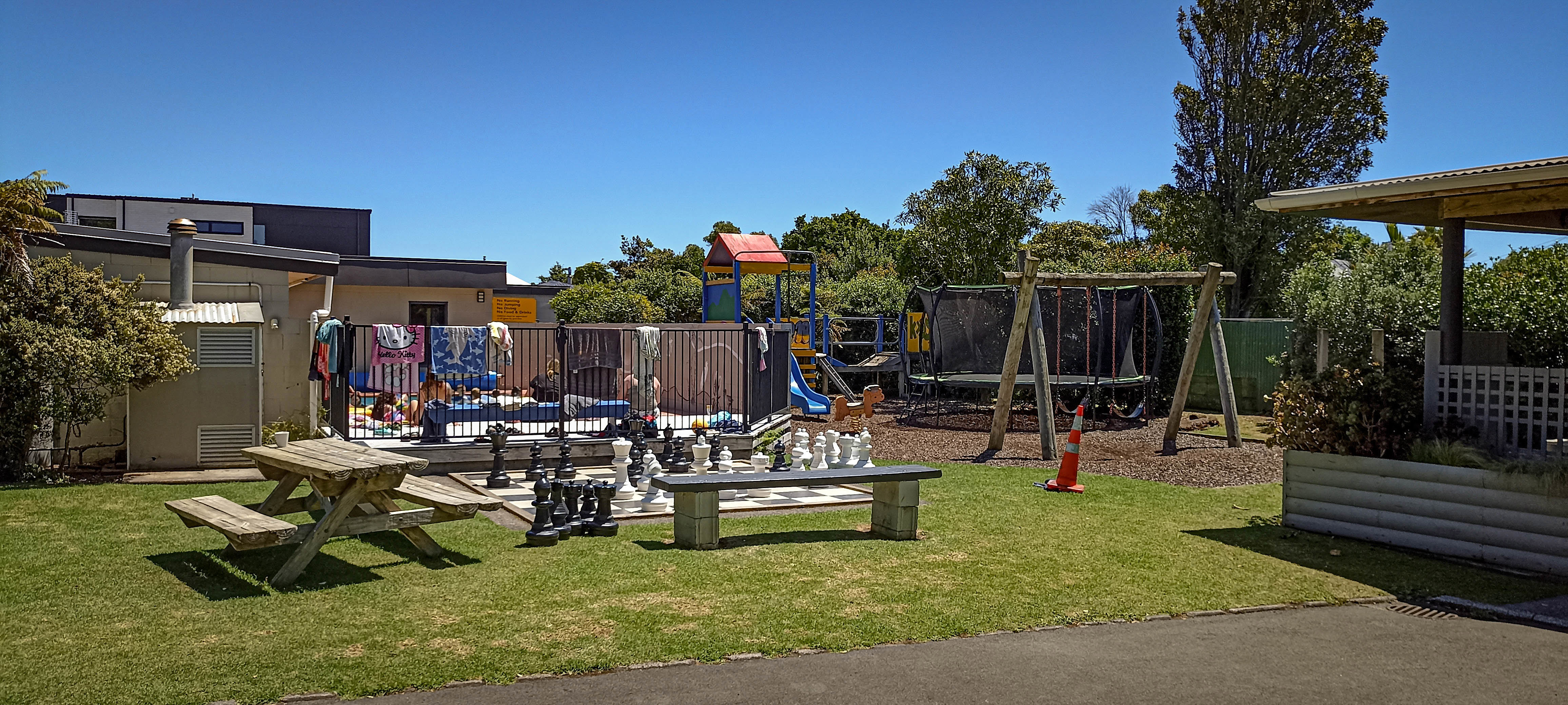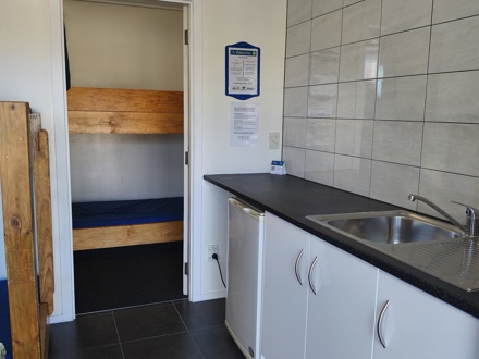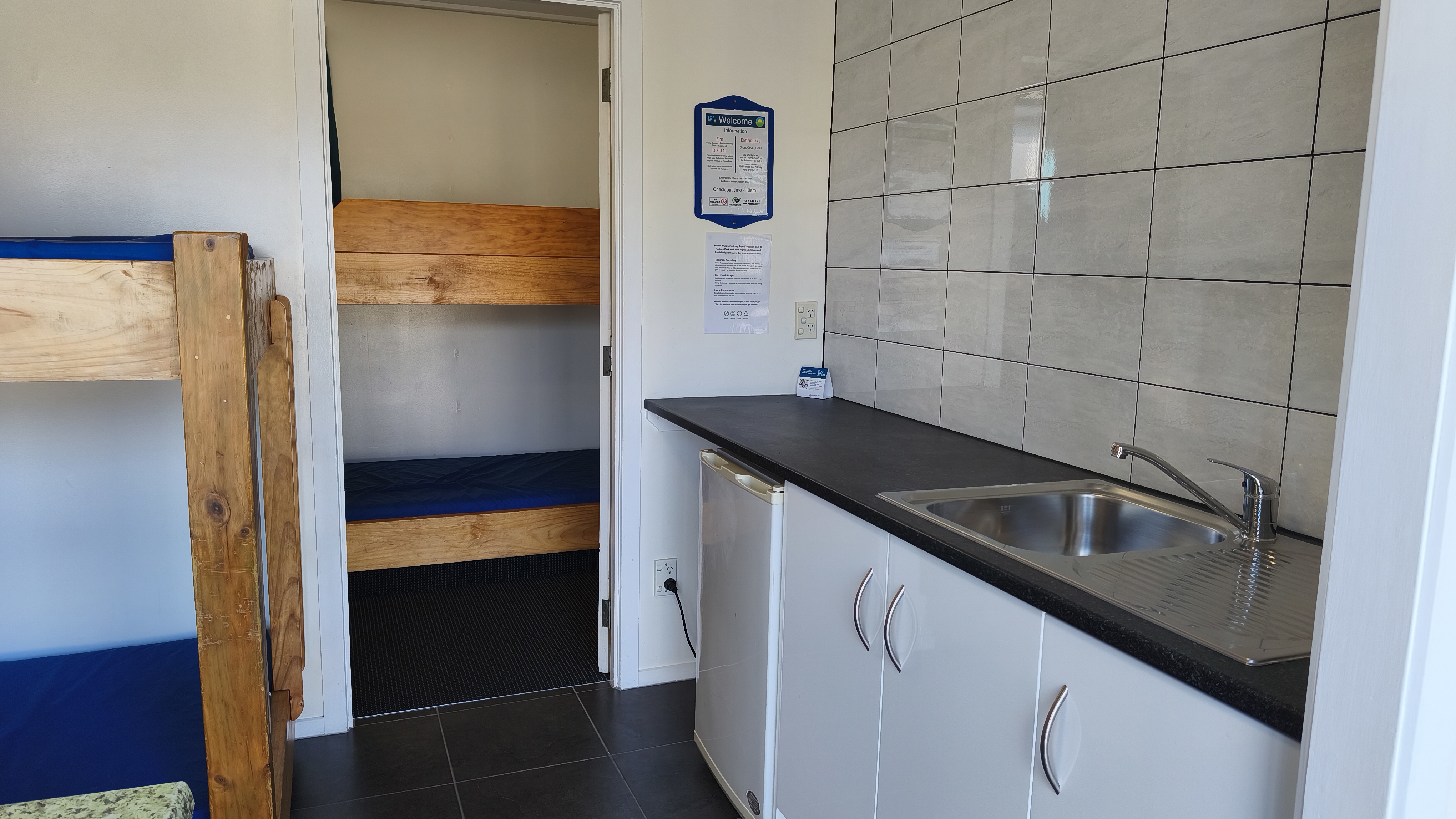 Front room has a breakfast kitchen with 2 sets of single bunks, back room has another two sets of single bunks. Throw your bags and sleeping bag on your choice of bed and head out to the park and find the heated swimming pool or the go-kartz.