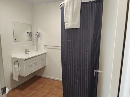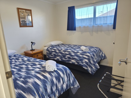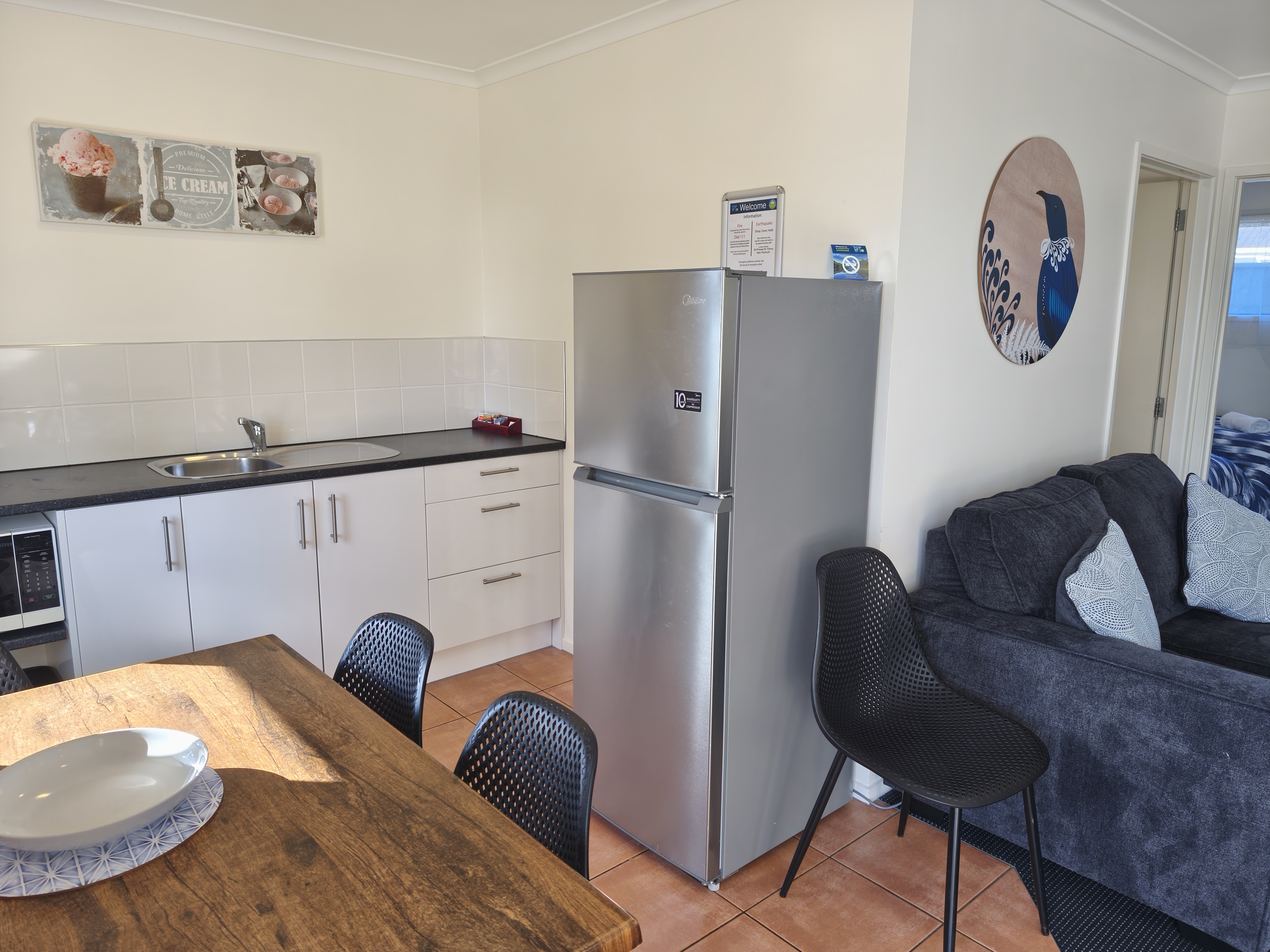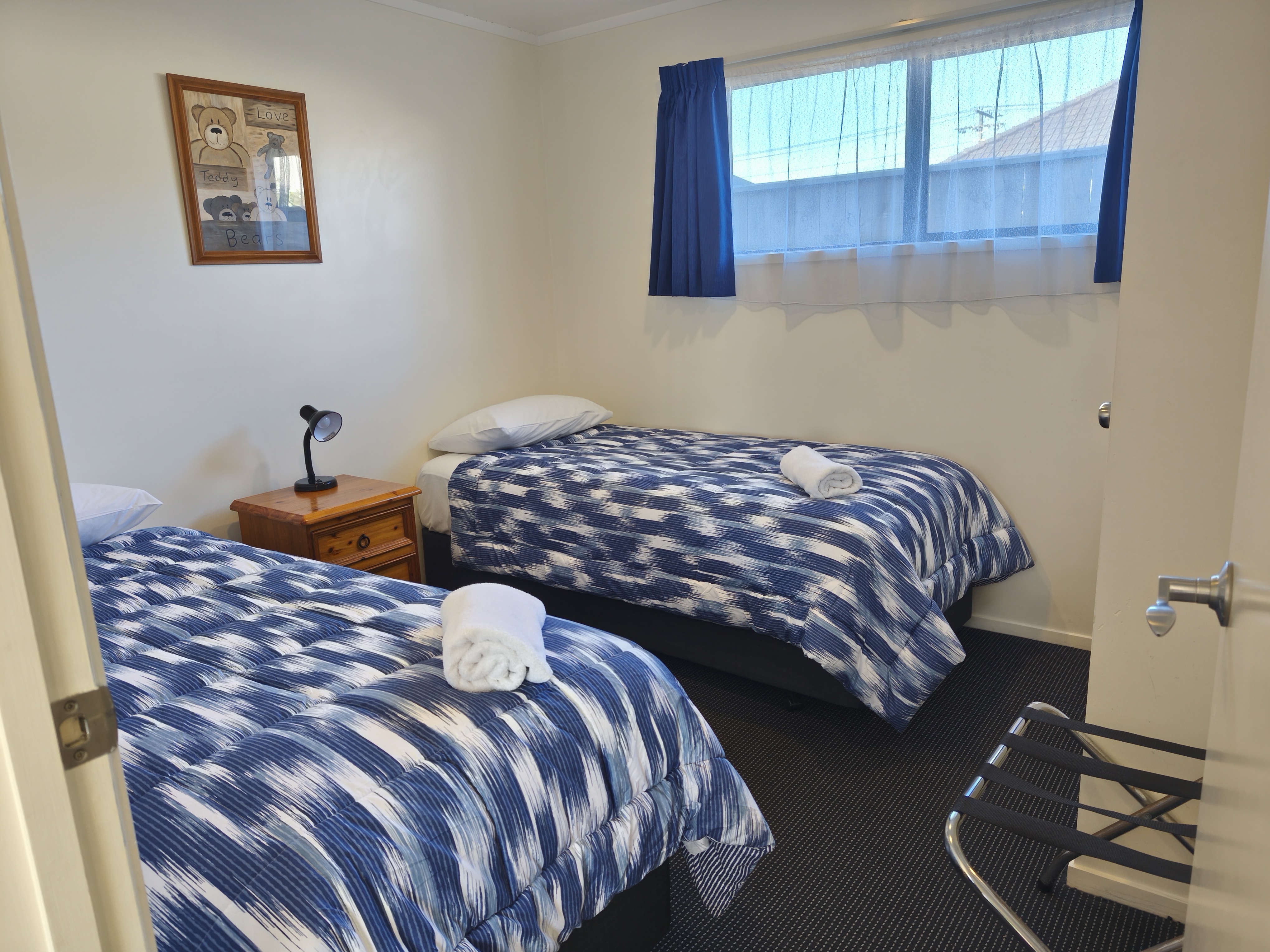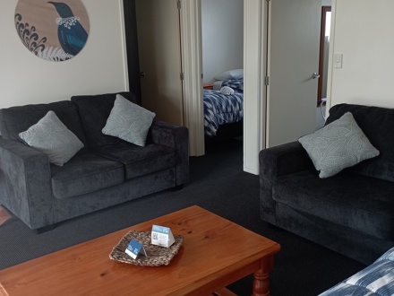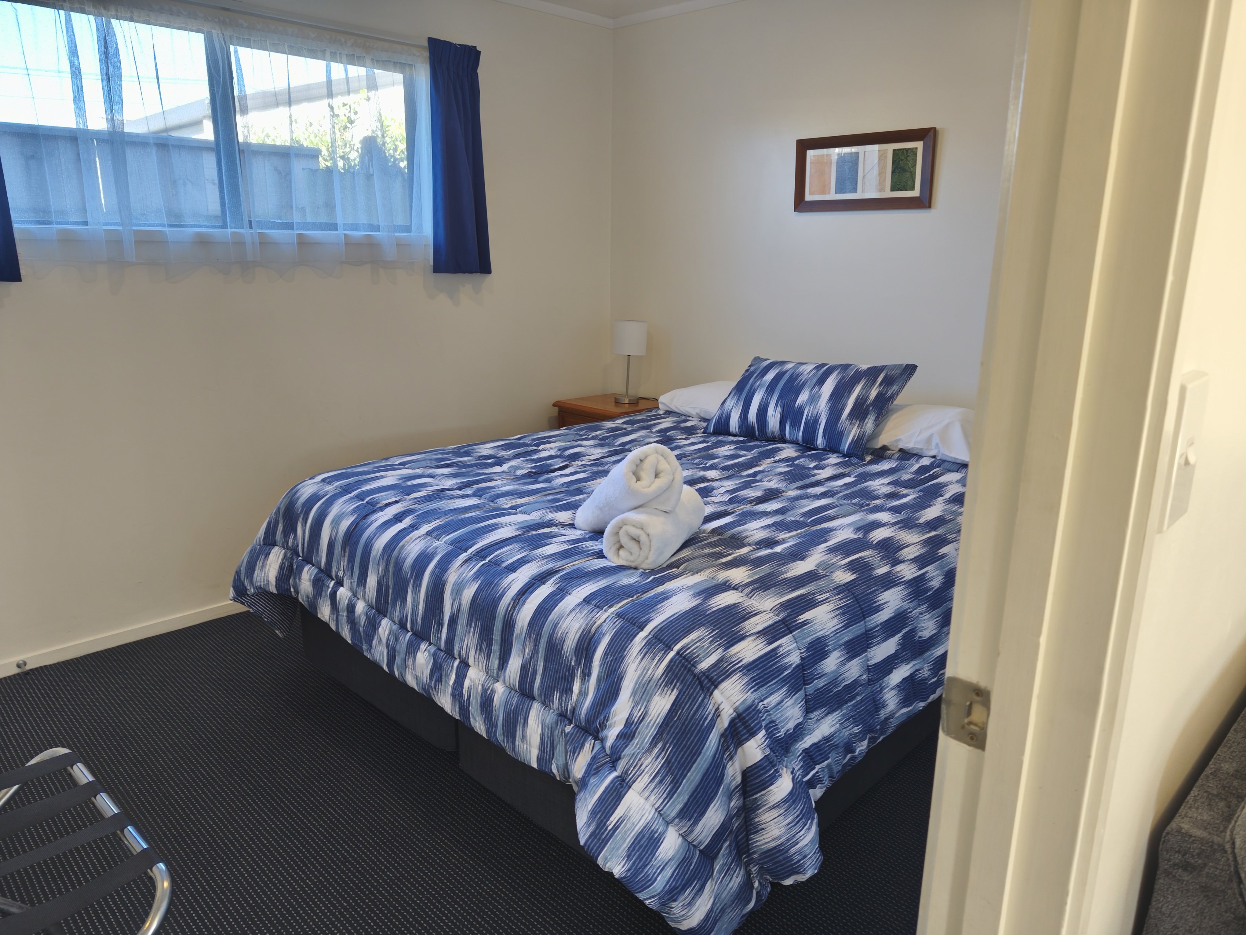 A bedroom with a king-sized bed, a second bedroom with two single beds. The living area is generously sized and includes a cozy lounge suite, a 55" flat screen, an iron, and a clothes rack. The unit comes with all necessary bedding and towels. The bathroom boasts a spacious open shower. Sliding doors lead to a compact deck with seating, while parking is available right in front of the unit. One of the units is designed to be accessible.