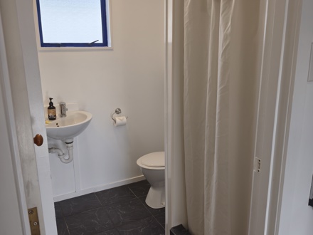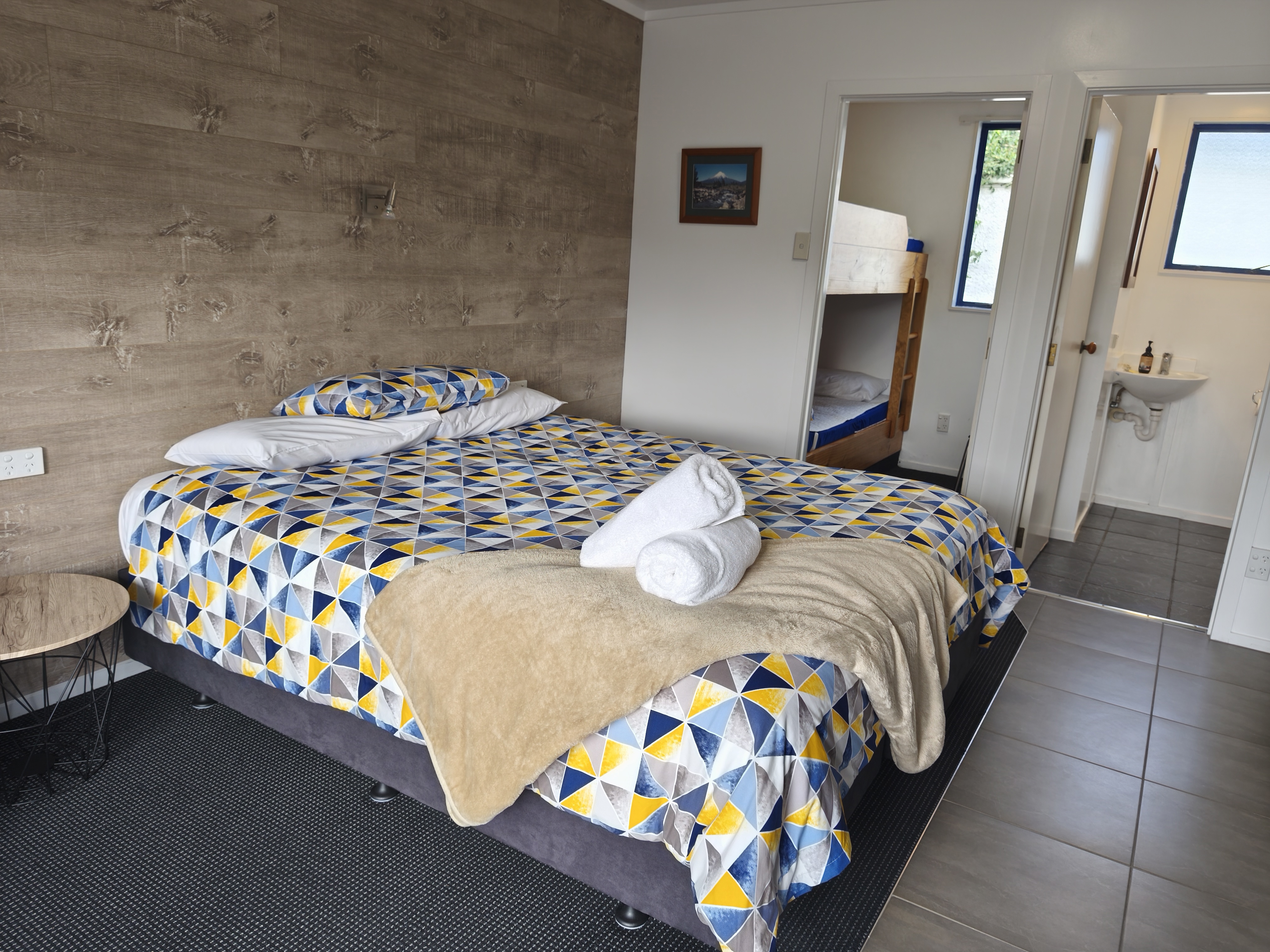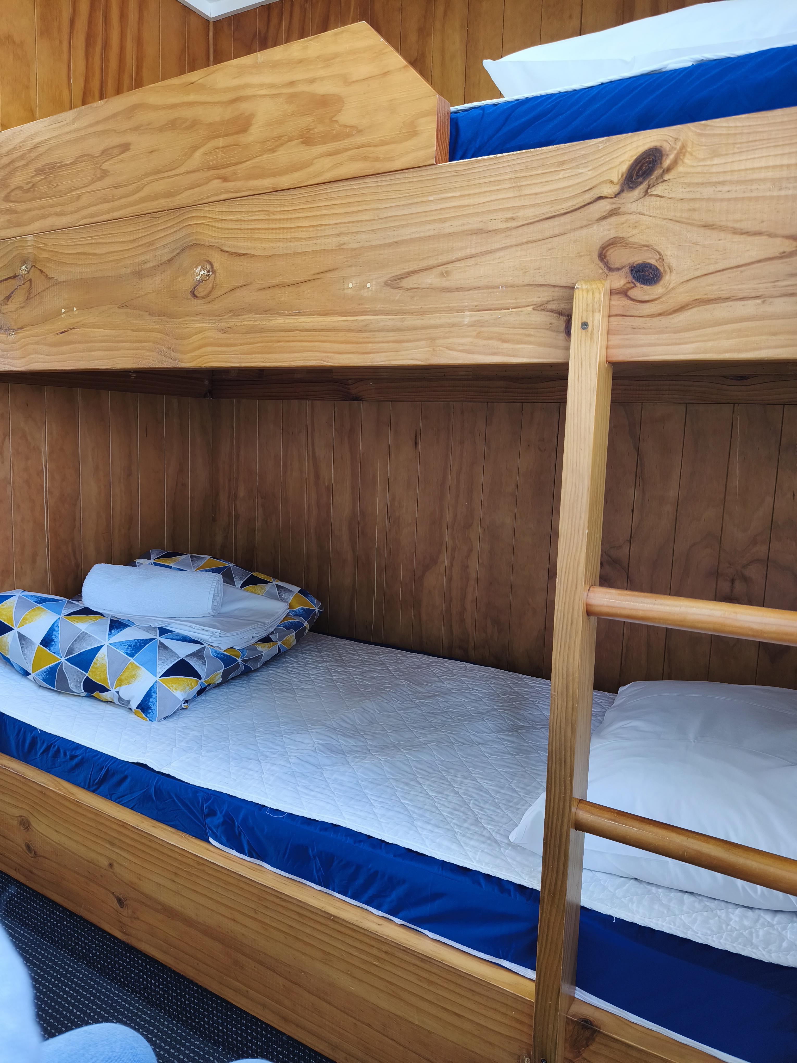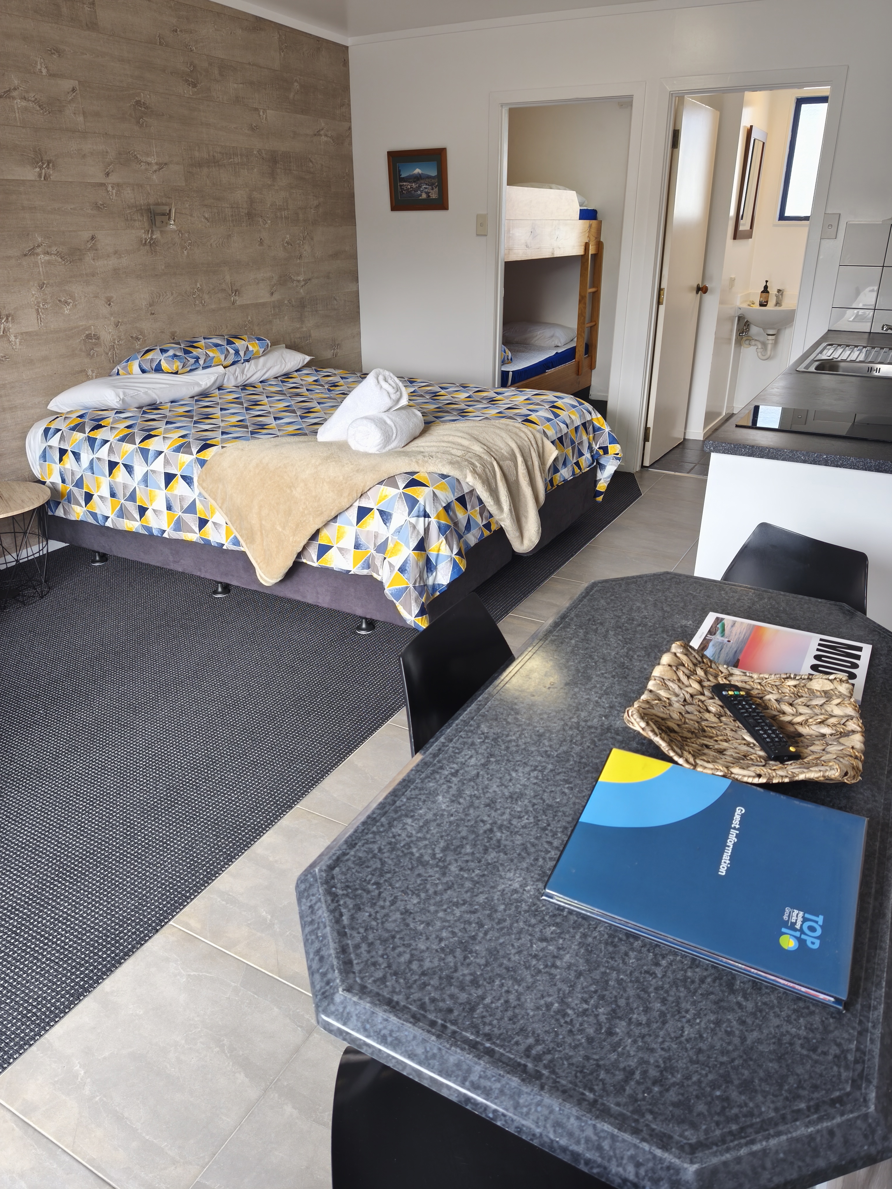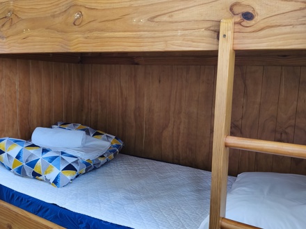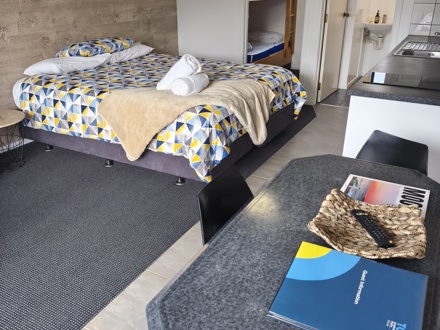 A studio-style Unit featuring a king-sized bed in the main living area and a compact bunk room at the rear with a set of sturdy built-in bunks. This Unit comes with its own private toilet, shower, equipped kitchen, and a T.V. The king bed is fully made up and bedding is provided for the bunk beds.