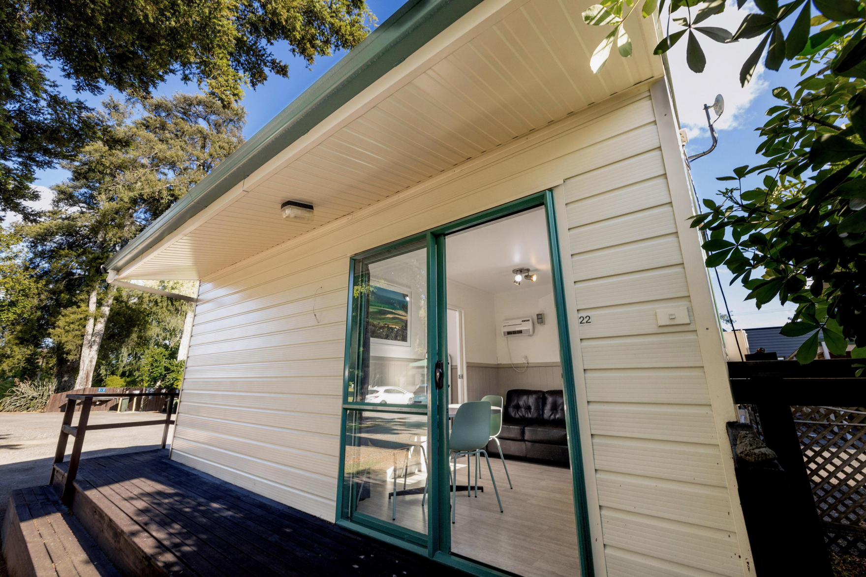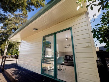 This standalone cabin with its own small deck is a fantastic choice for a small family or a group of friends wanting the convenience of their own kitchen while using our shared bathroom facilities.