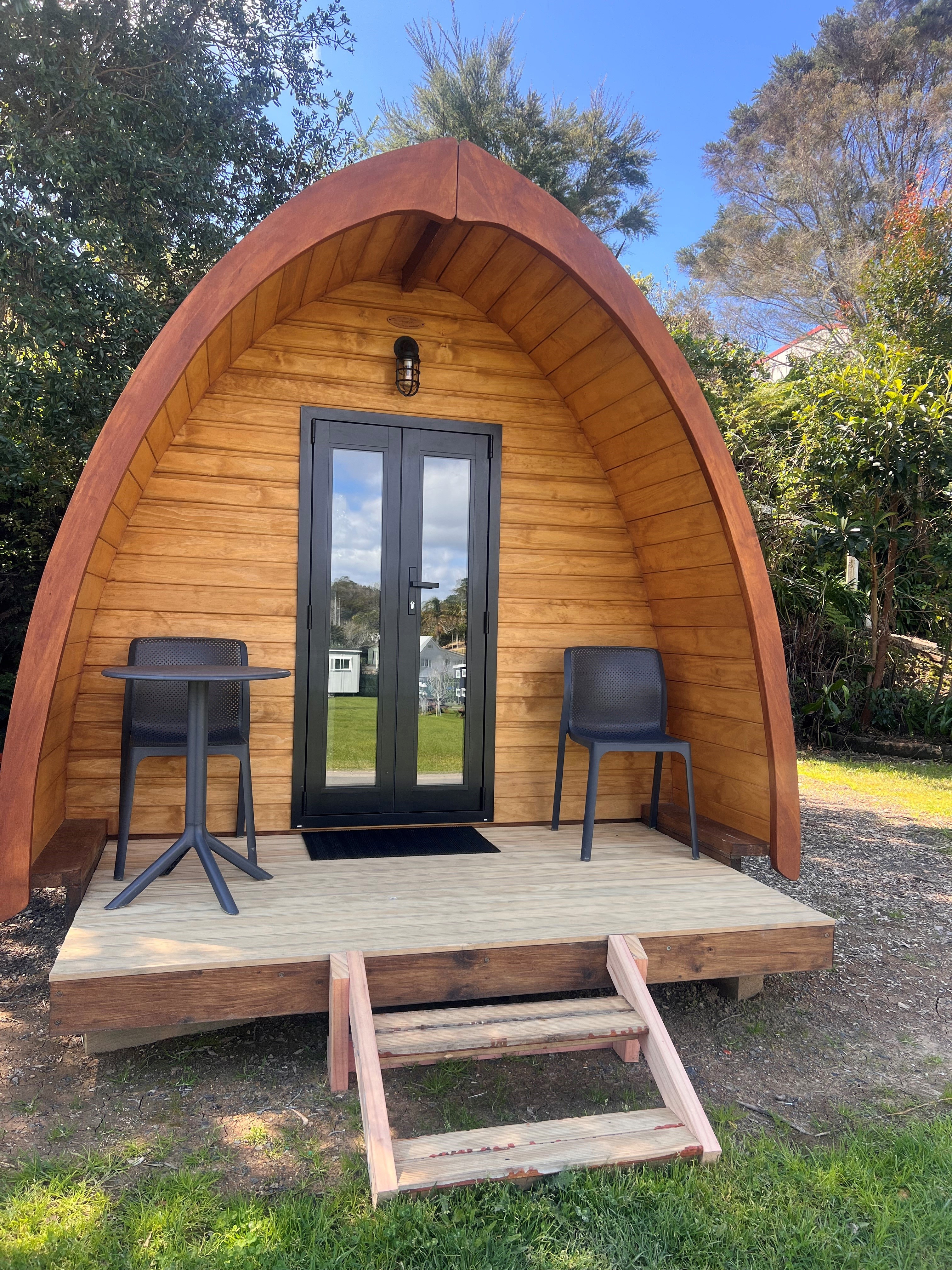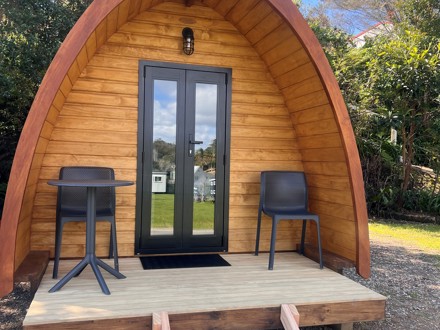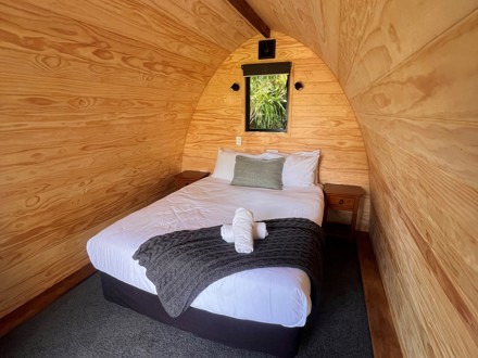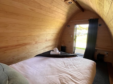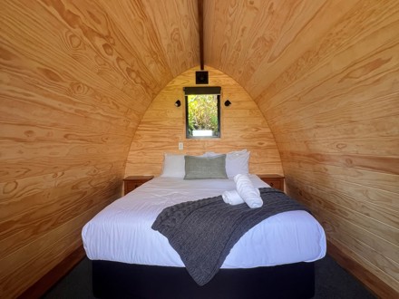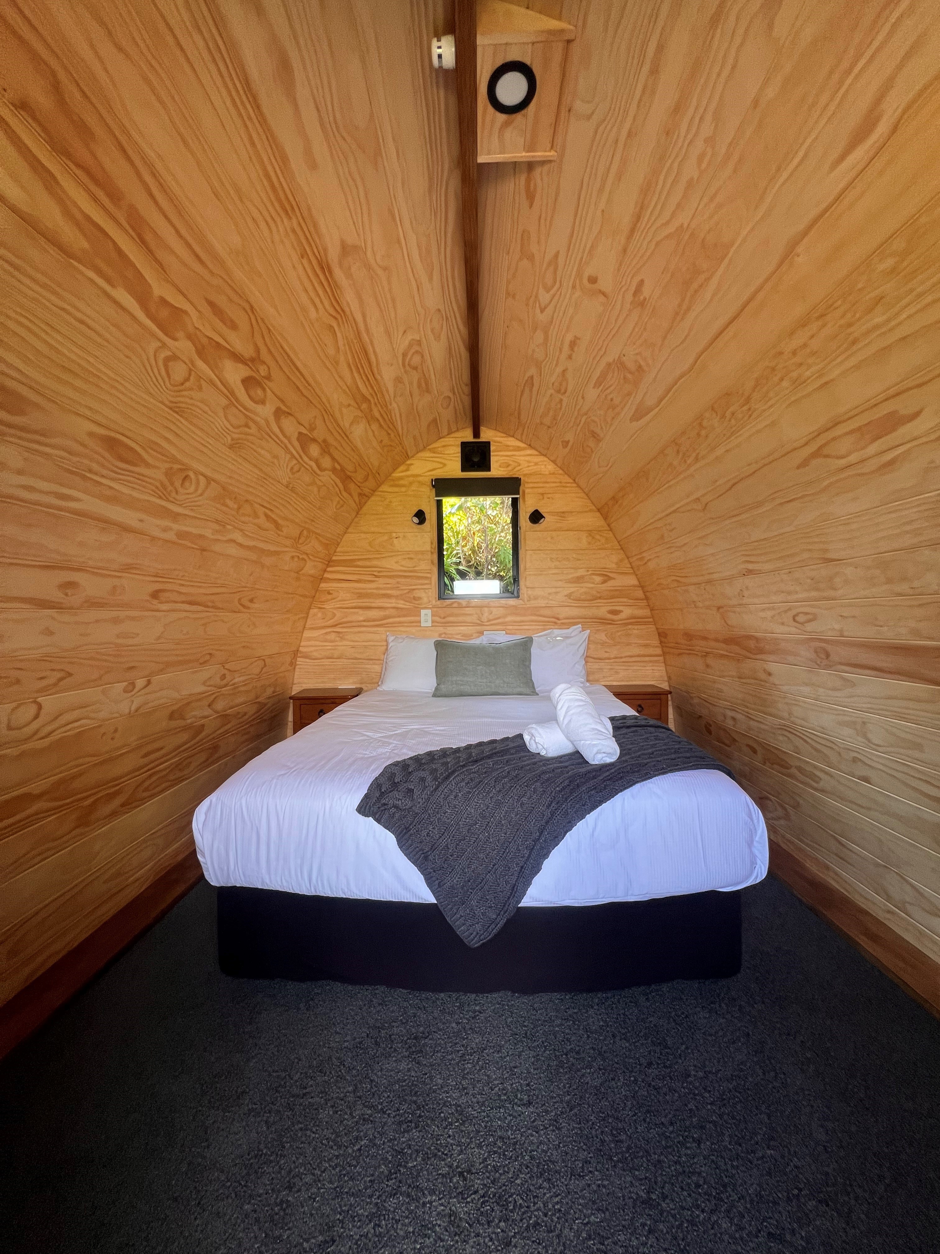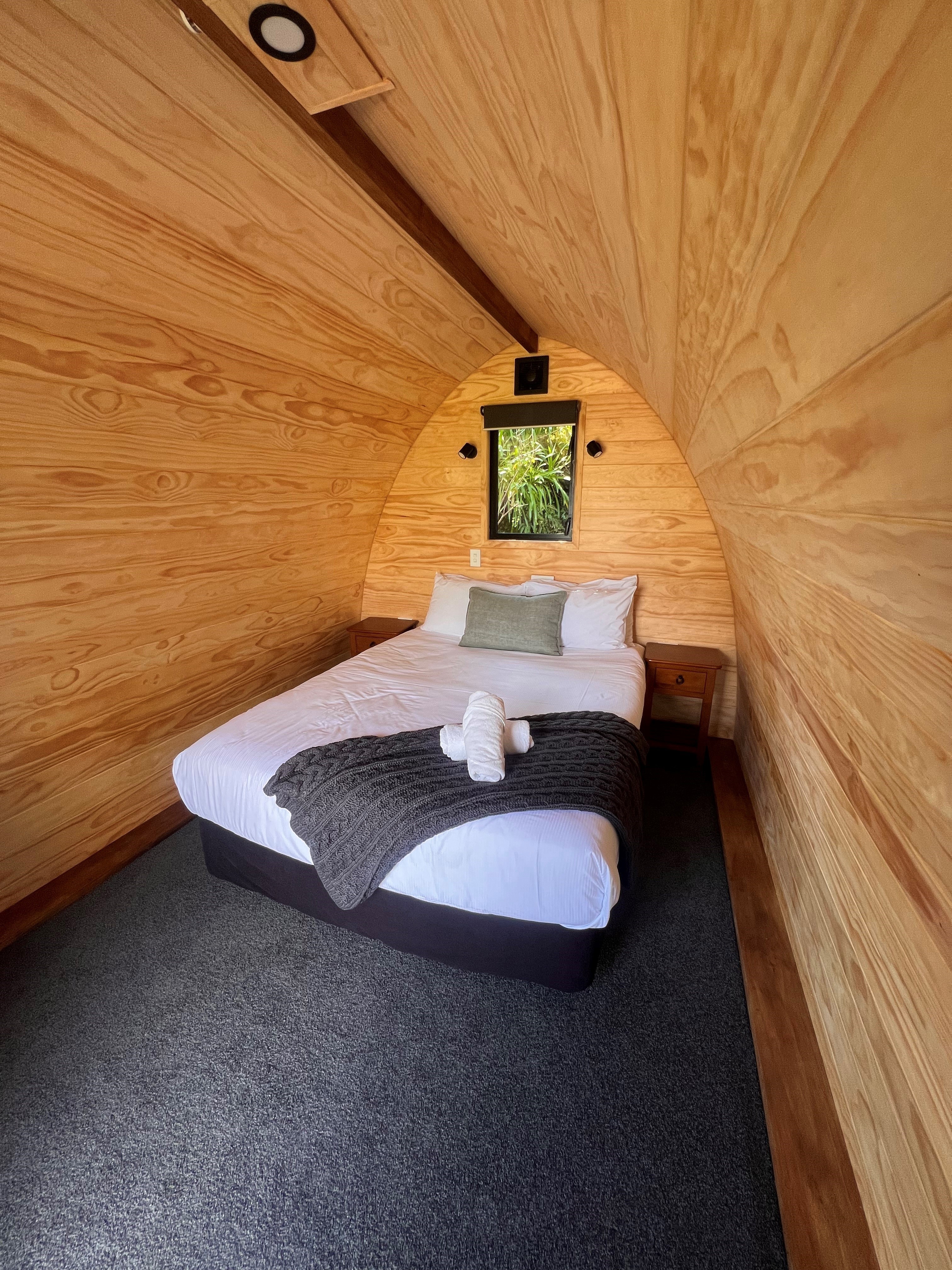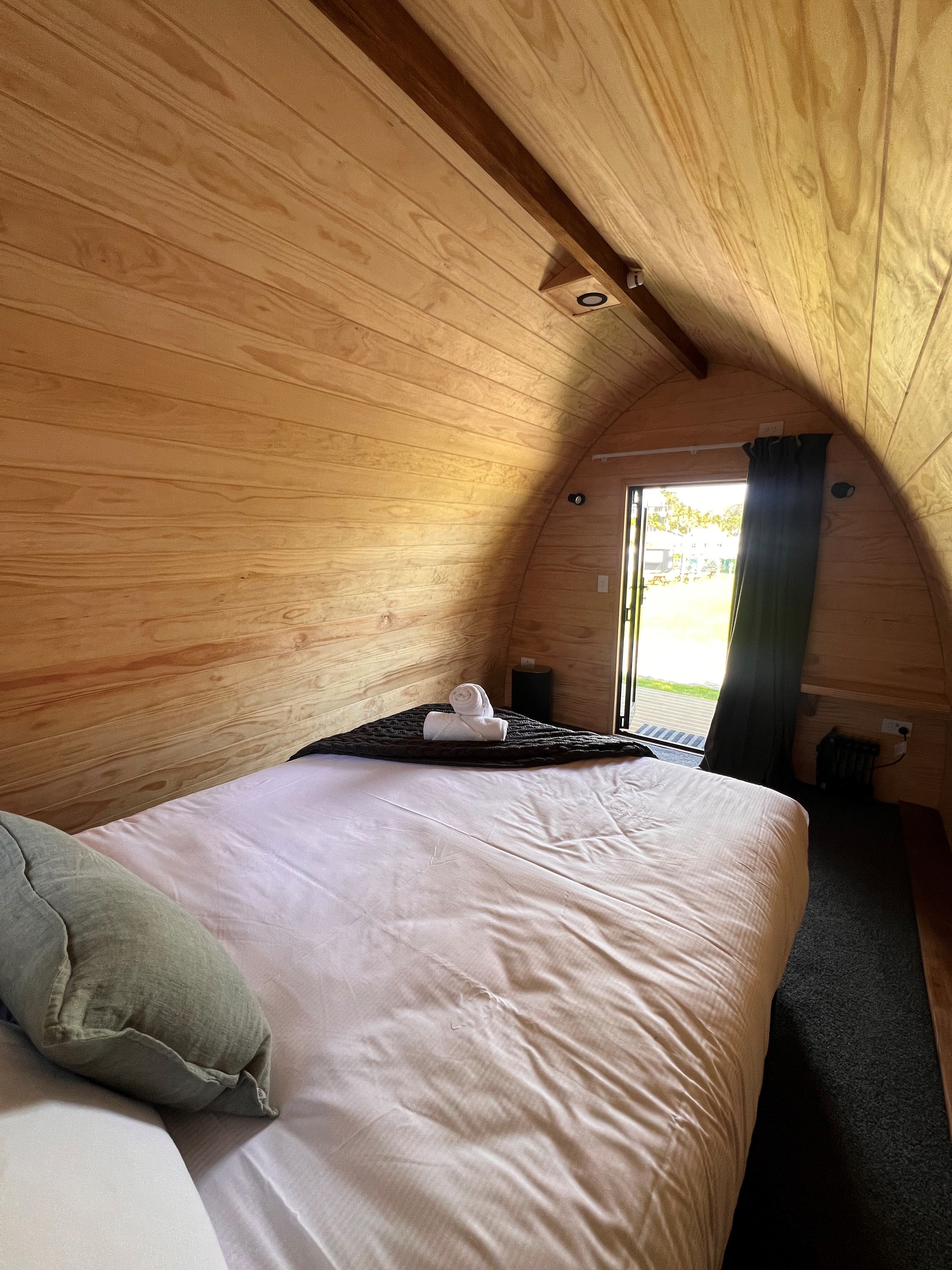 Our cosy wooden pod offers a unique and inviting stay in our campground. Featuring natural timber interiors, a comfortable queen bed for two with crisp linens and thoughtful touches like fresh towels and a warm throw, these pods are designed for comfort and simplicity. A small window frames the surrounding greenery, bringing light and a touch of nature indoors – the perfect retreat after a day of exploring.