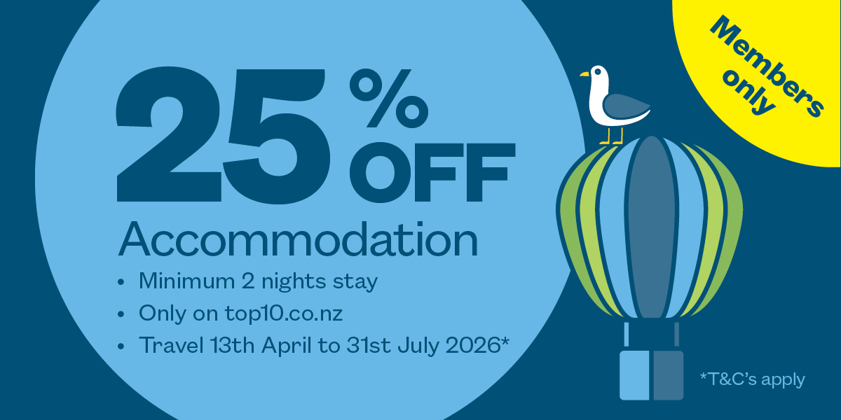 This promotion is available to active TOP 10 Club Members and applies to new bookings only, bookable between 7th and 19th April 2026. Bookings must be made directly on www.top10.co.nz, for travel between 13th April and 31st July (excluding ANZAC weekend, King's Birthday weekend and Matariki weekend). Additional terms and conditions apply, please see below.