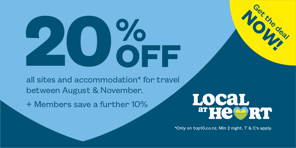 We're excited to share that most Parks are participating for the ENTIRE promotional period so go get your school holiday booking locked in quick. Please note that this is only available on new bookings and must be booked on top10.co.nz.